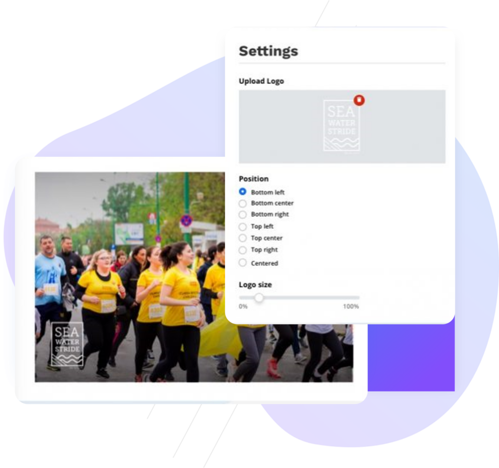 Photos are a great way to drive impressions, which is why we have given you the opportunity to add a logo to your photos. This is a great way to increase visibility for your brand or sponsors you work with. Easily customise the placement of your logo and adjust its size right from our watermark editor.